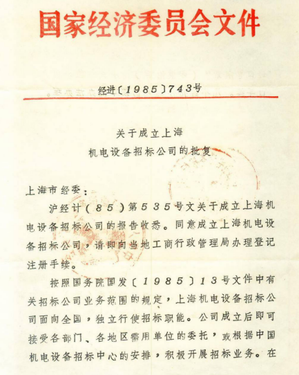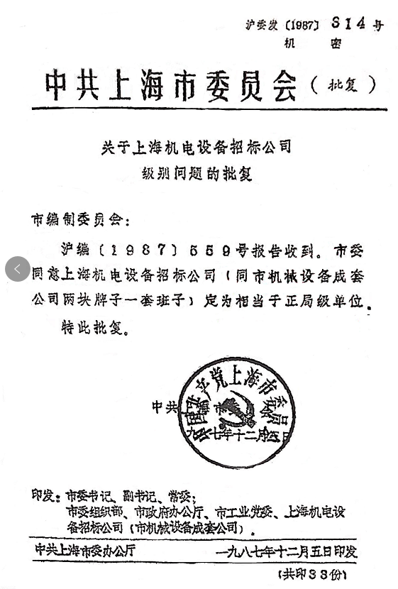 中共上海市委批復(fù)上海機電設(shè)備招標(biāo)公司定為相當(dāng)于“正局級”單位。