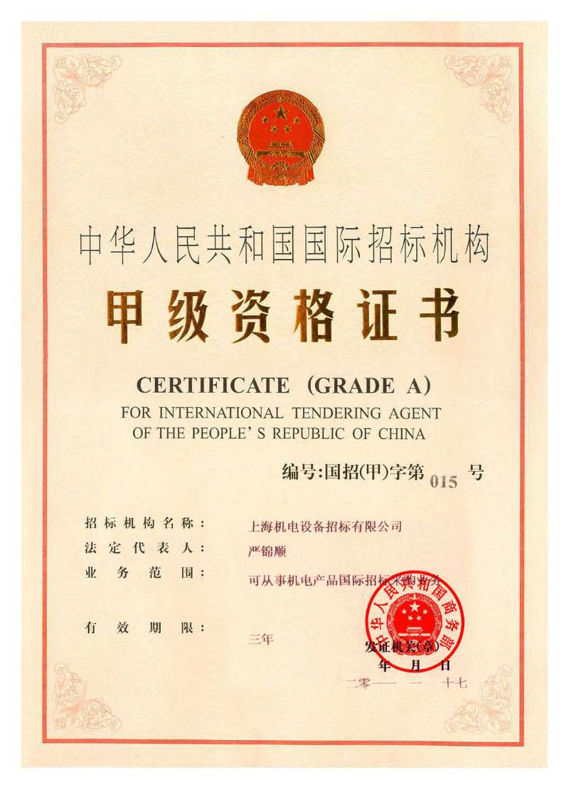 國家對外貿(mào)易經(jīng)濟合作部授予的首批《國際招標(biāo)機構(gòu)甲級資格證書》。